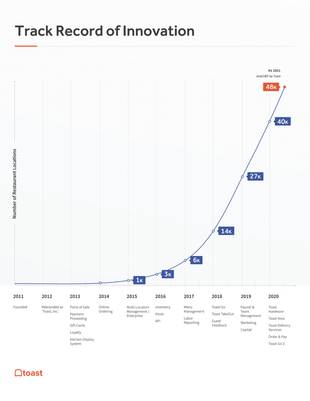 Toast exploded around Year 6-7, and you can see an incredible power-law curve taking off. But it took 6+ years to get there. The company exploded from 3,000 restaurant locations in 2016 to 40,000 in 2020. Wow.