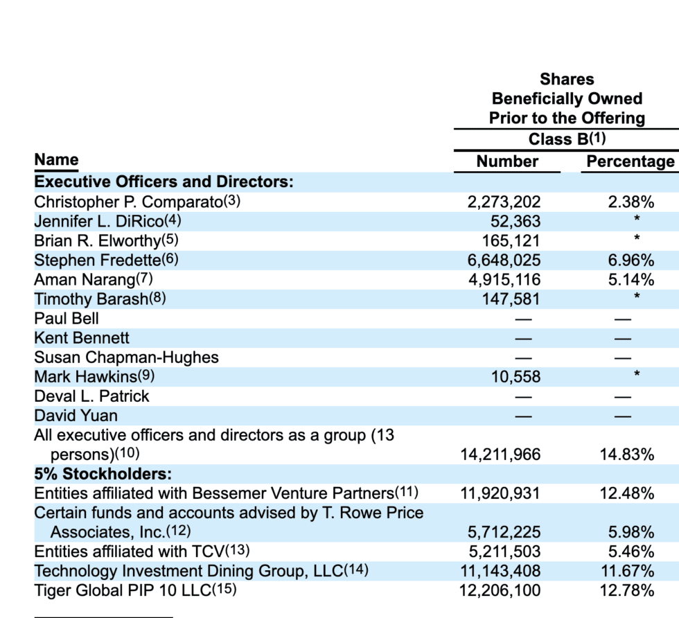 It’s been a capital-intensive business with those lower margins and hardware. The co-founders now own 7% and 5% each (Fredette and Narang), and the outside CEO 2.4% (Comparato) plus more grants.
