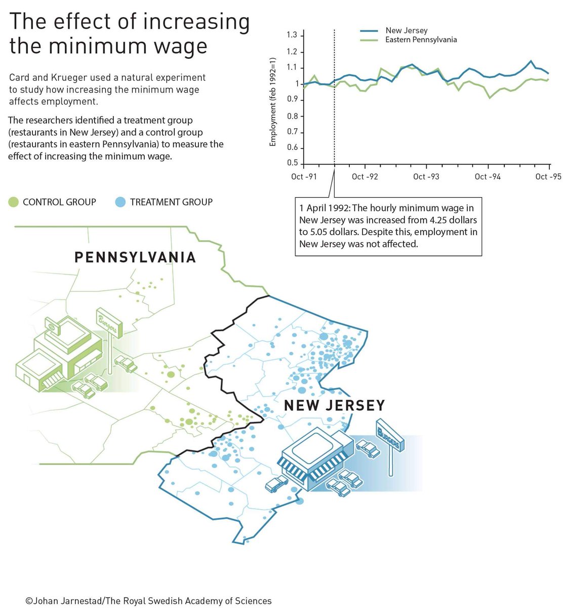 Card's experiment compared NJ and PA, two similar locales. NJ had a minimum wage increase but PA did not. This made 2 groups: