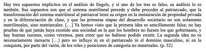 Ningún antropólogo social serio (Malinowski, Evans-Pritchard, Harris, Lévi-Strauss...) desde el siglo XX defiende la teoría de la familia de Engels, que se basa en Morgan que a su vez ni siquiera hizo trabajo de campo. Aquí la crítica de Goldberg: