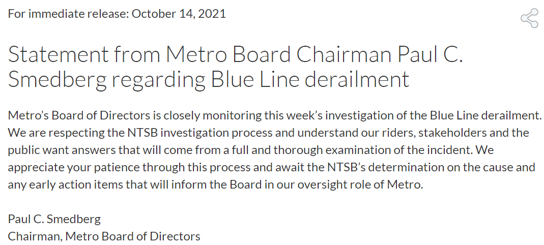 The #wmata Board issued a brief statement about Tuesday's derailment. They are "closely monitoring" the investigation and say they're awaiting the NTSB's determination of root cause.