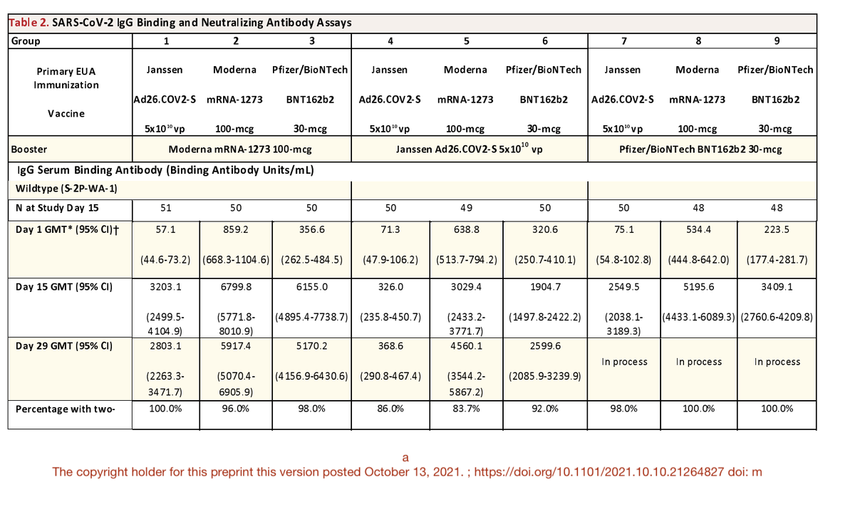 Los boosters se dieron con J&J, Moderna y Pfizer (Moderna mRNA- 100-mcg, Janssen Ad26.COV2.S 5x1010 partículas virales, o Pfizer-BioNTech 30-mcg), con un total de NUEVE combinaciones posibles. Se evaluó inmunogenicidad y seguridad a los 15 y 29 días de recibir el booster.
