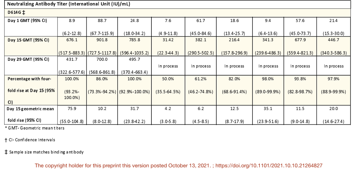 OJO: aquí no hicieron pruebas estadísticas para evaluar si hay diferencias significativas en títulos de anticuerpos entre los 9 grupos evaluados. Seguramente eso lo reportarán en la publicación final. También están pendientes resultados a los 29 días.