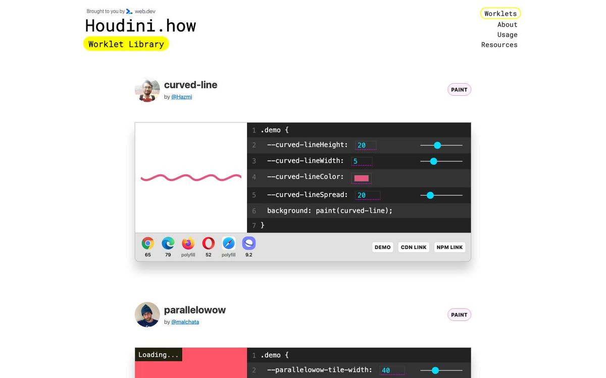 The community-driven resource library of CSS Houdini worklets. Learn about CSS Houdini, its APIs, usage, polyfills, and browser status, to take advantage of the Houdini APIs today.