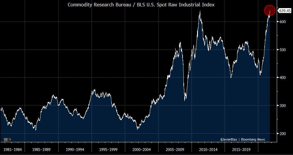 My favorite commodity index has hit an **all-time high**. This is the CRB / BLS US spot raw industrials index, a measure of some really old fashioned commodities. If you are on @TheTerminal, the ticker is CRB RIND Index [GO]. If you want to know more, see the nerd thread 🤓🧵 1/6