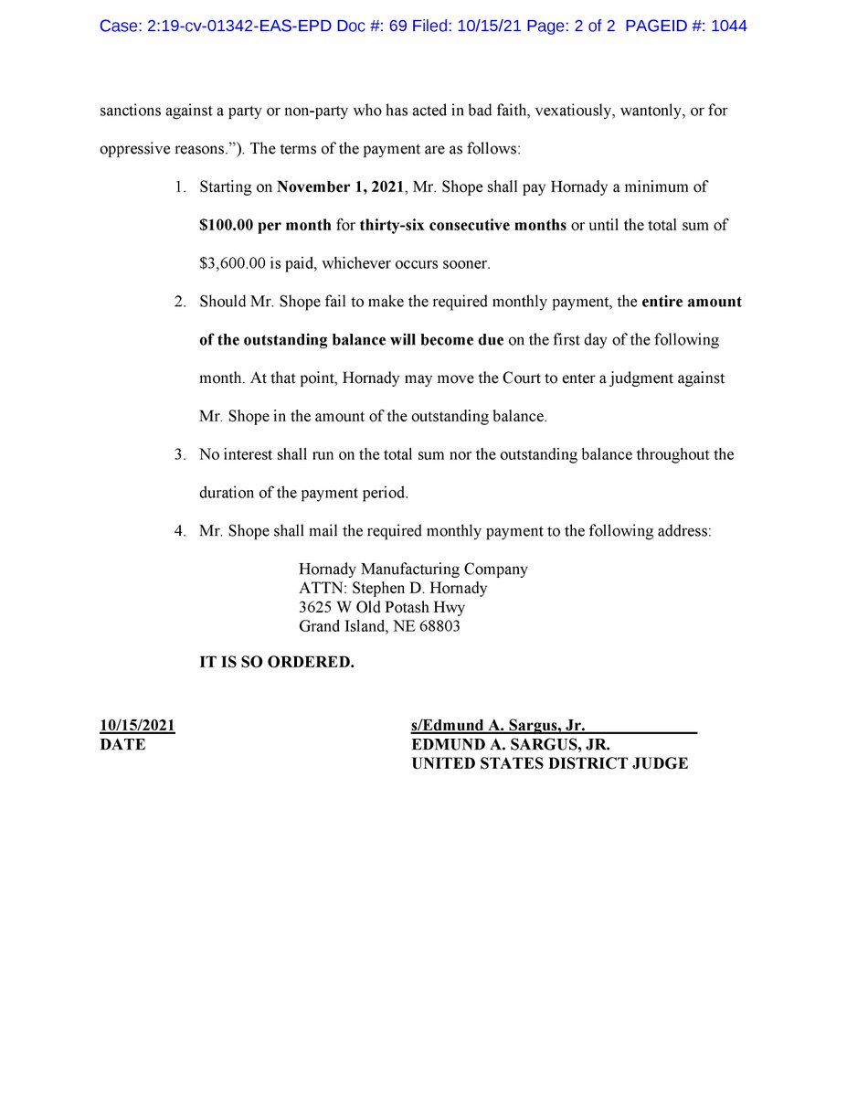 Mr. Shope sent a letter to the court last May after learning that Hornady wanted sanctions against him, where he said that the company "was kinda nasty with me" and that "it wasn't a deliberate lie or my grandson would have won, not lost."