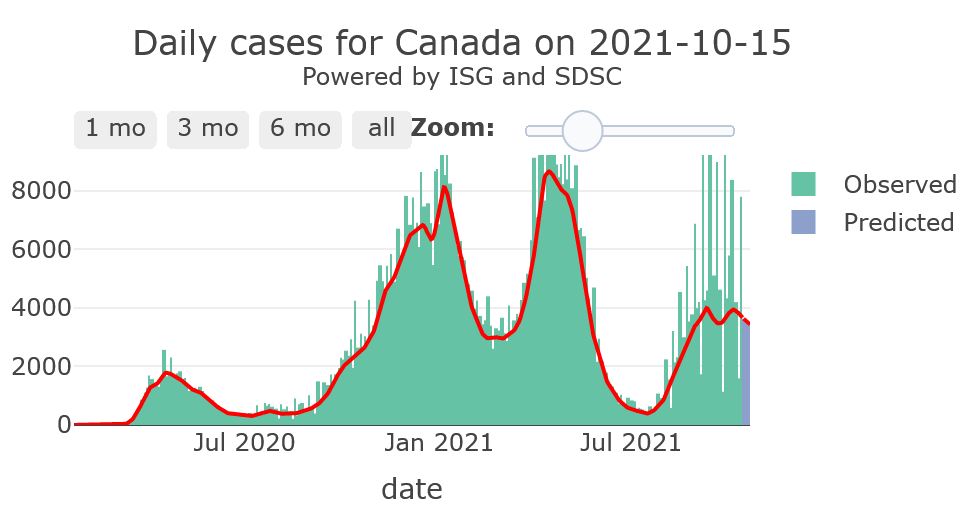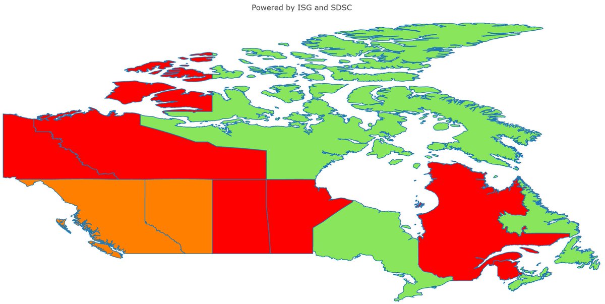 Canada is plateauing in its #COVID19 epid activ, med mort, 78.7% 1 dose: Red in 6 prov/terr, green in Ontario, Orange in Alberta; BC.