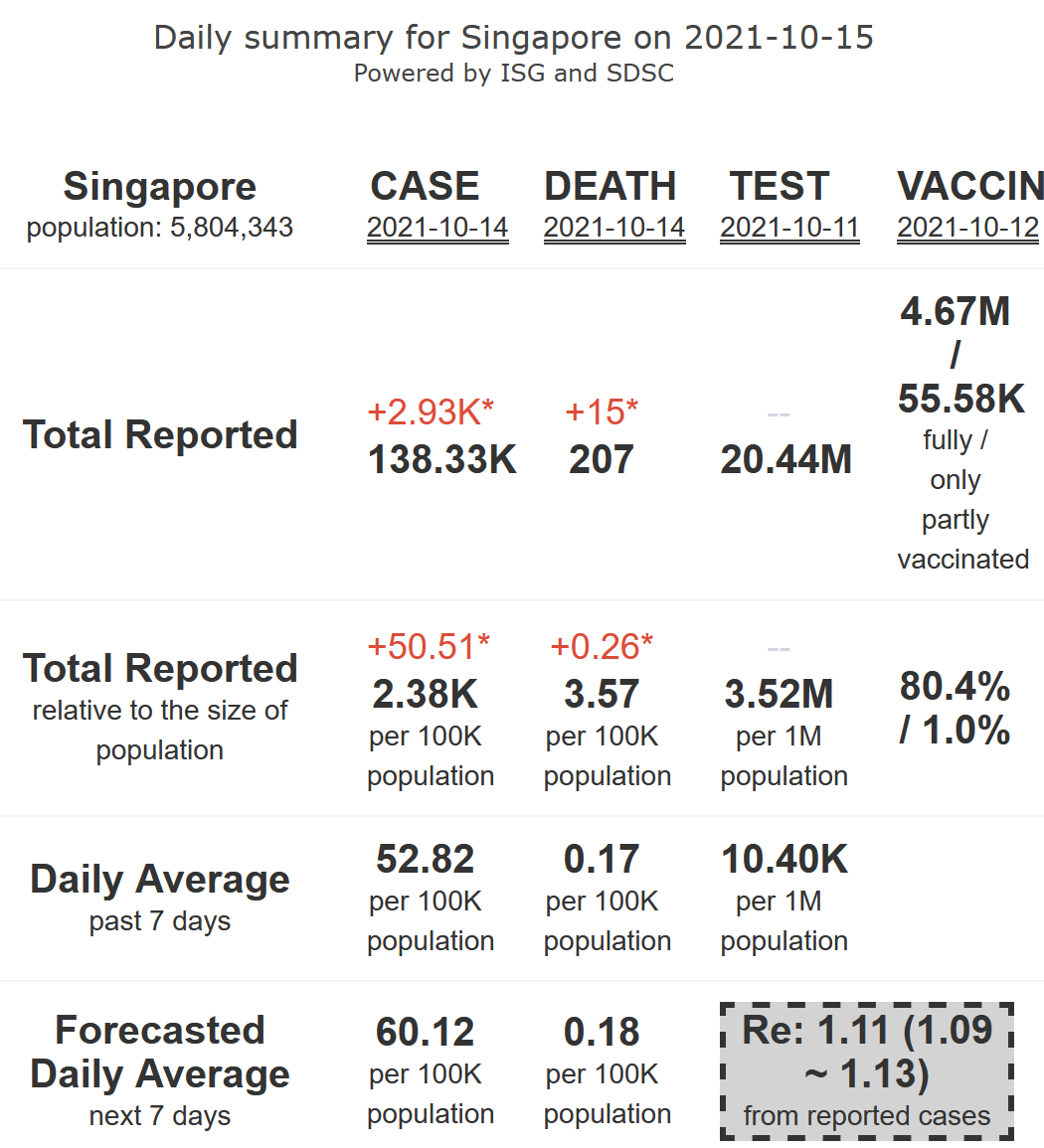 Singapore (R-eff=1.11, 81.4% received 1 dose) surges at high level in its #COVID19 epidemic activity, with med mortality, for 7 more d.