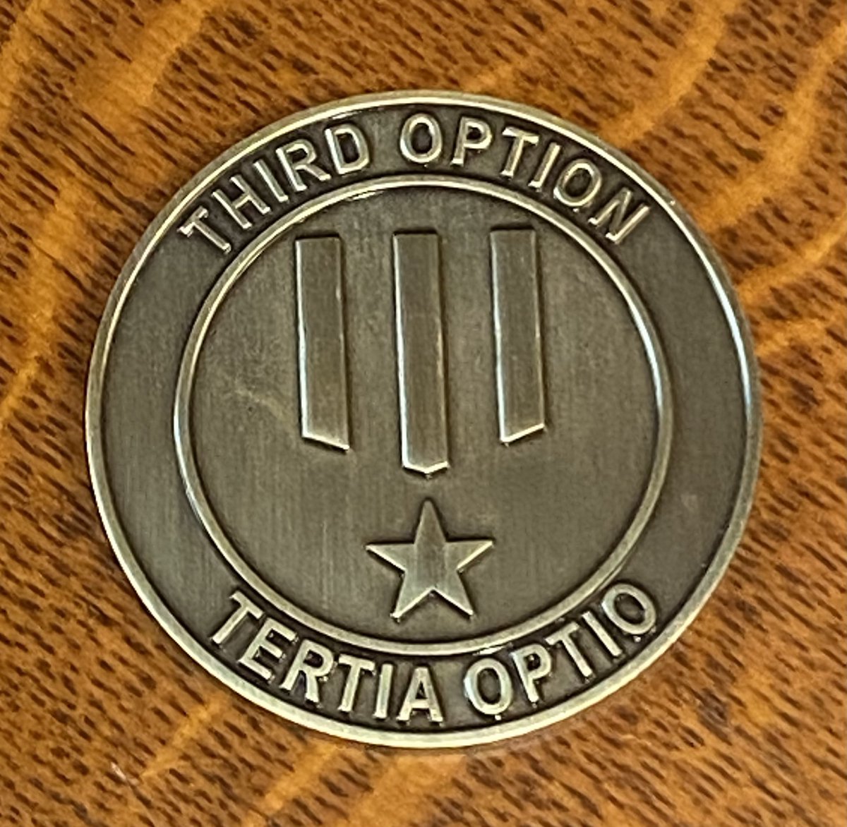 Chap. 3. - THIRD OPTION. Motto of Special Activities Division (Alton: Tertia Optio). Mike Spann & 3 more of 8 in Team Alpha were SAD paramilitary officers. Refers to covert action as 3rd option after diplomacy & mil. force. This is challenge coin given to me by ex SAD officer - 4