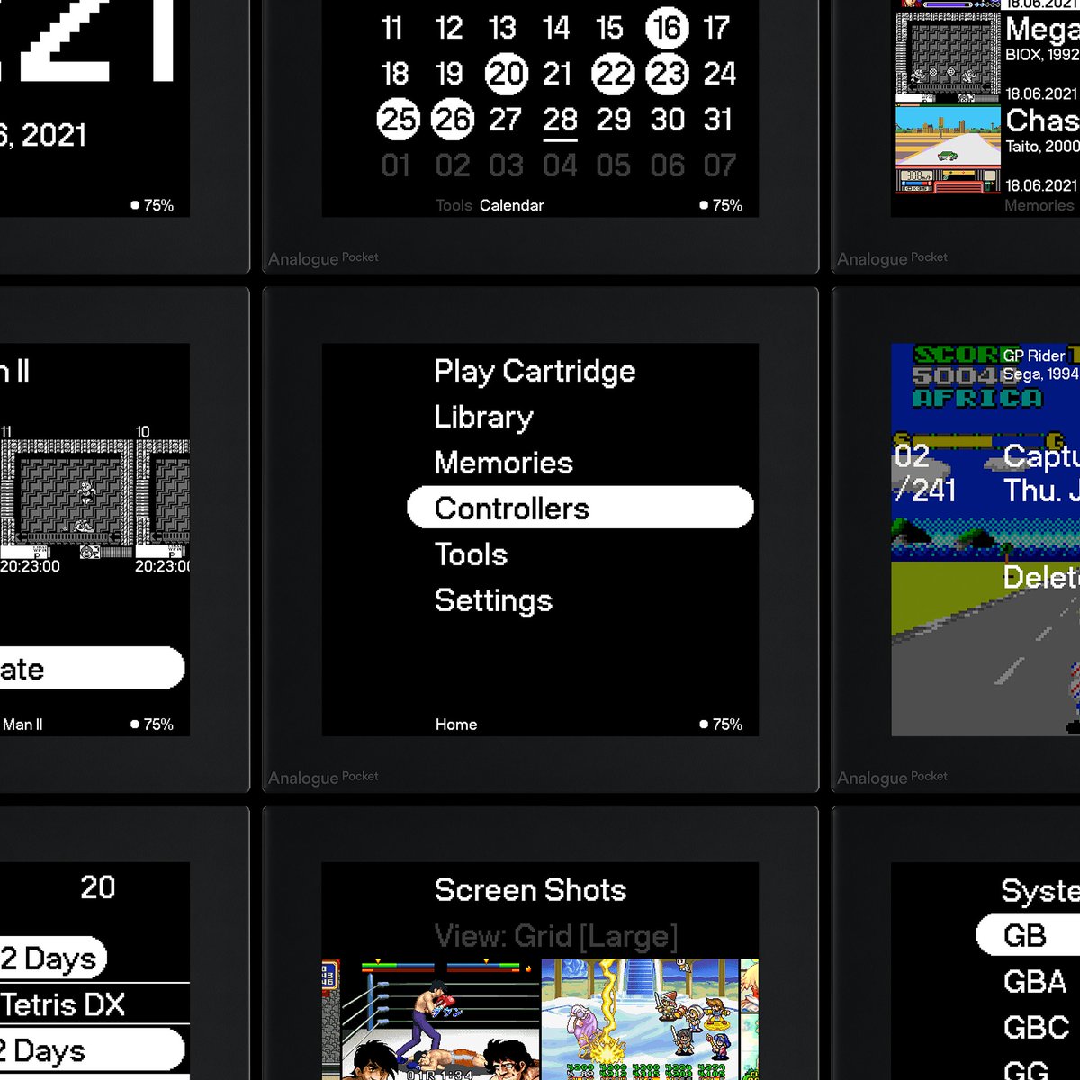 *Library, Memories, & Tracking will not be available on Analogue OS 1.0. These features will be available on Analogue OS 1.1 and beyond. Coming shortly after Pocket is released. Analogue OS is a work in progress and its representation is subject to change.