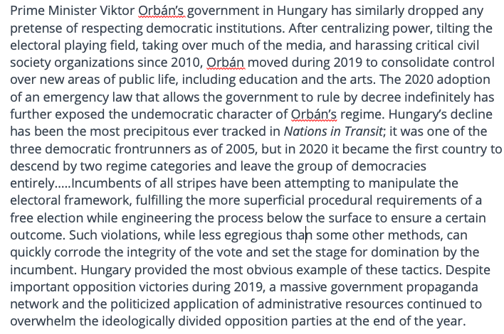 For context, here is analysis of Hungary’s democratic decline by Freedom House, an independent/nonpartisan watchdog organization dedicated to the expansion of freedom and democracy around the world. 22/ freedomhouse.org/report/nations…