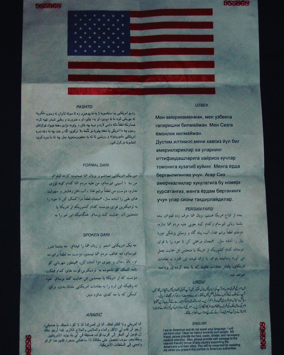Team Alpha members carried no identification apart from a silk “blood chit” offering a reward to anyone who might help him. In Pashto, Dari, Uzbek, Farsi, and Urdu, it stated: “I am an American and do not speak your language. I will not harm you! I bear no malice.” - 25