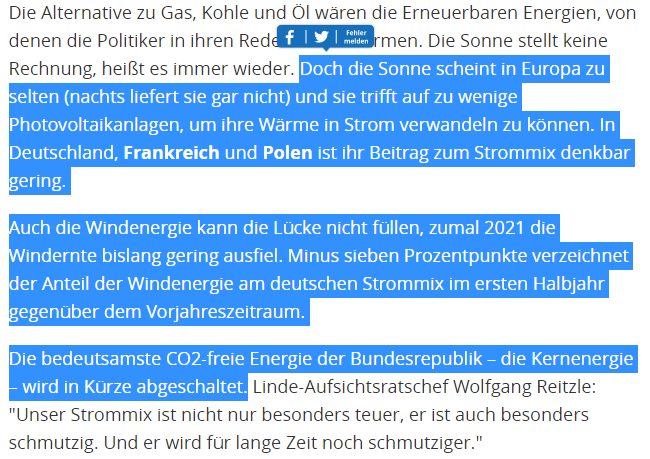 Ganz Europa spürt gerade schmerzhaft, wie teuer die Abhängigkeit von Energieimporten werden kann und der Zorn entlädt sich auf eine seit 16 Jahren in der Opposition arbeitende Partei, die noch nie das Energieministerium geleitet hat und die fossile Abhängigkeit beenden will. 🤷♂️🤦♂️