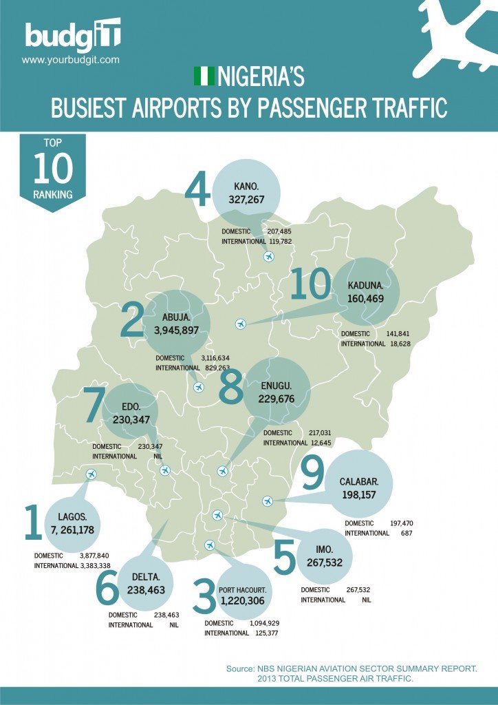 4. 2013 data, but still relevant. build airports with data. excluding Lagos and Abuja, the busiest airports all in the SS and SE, except Kaduna.