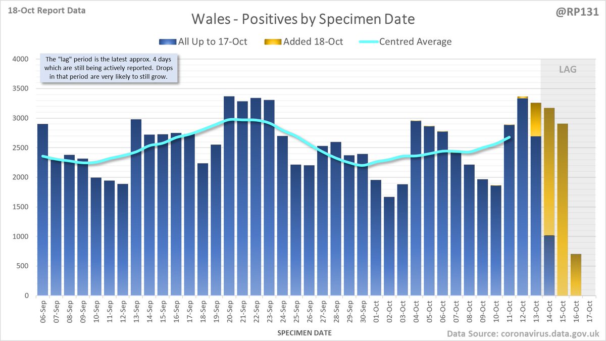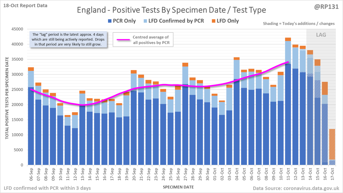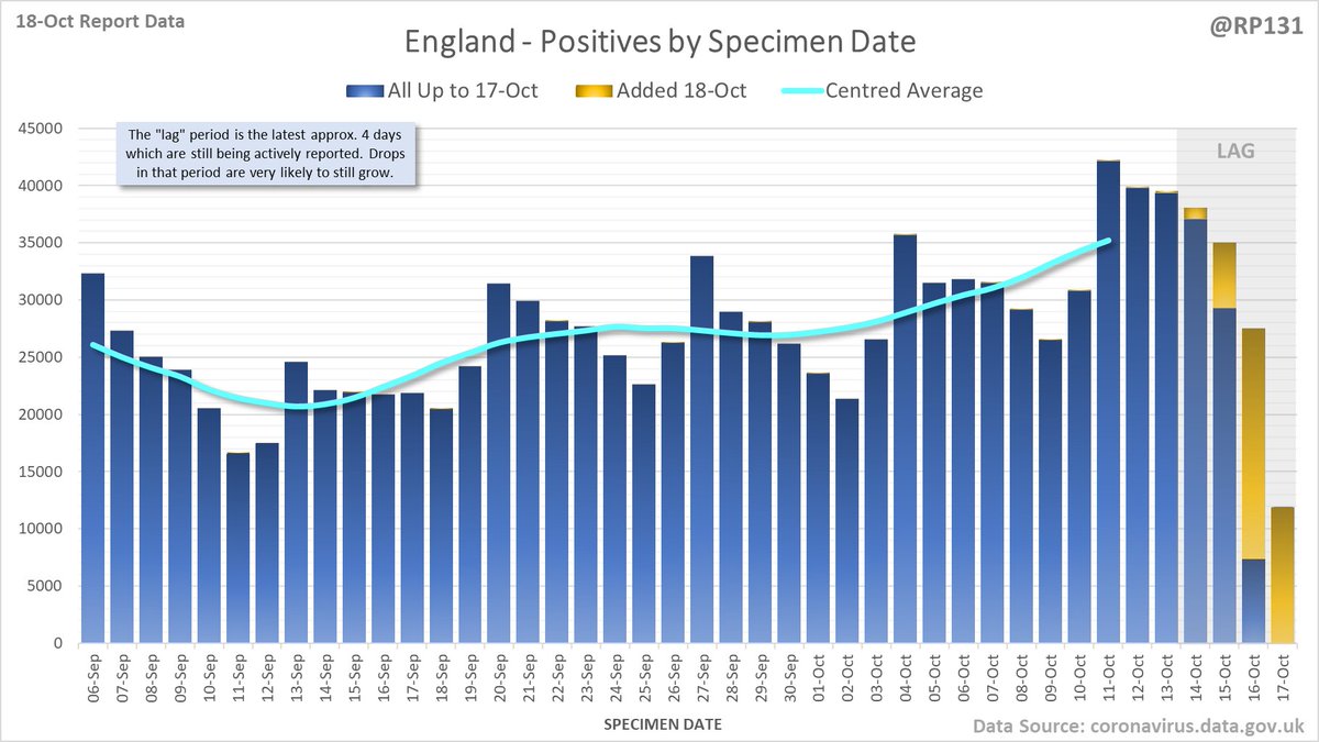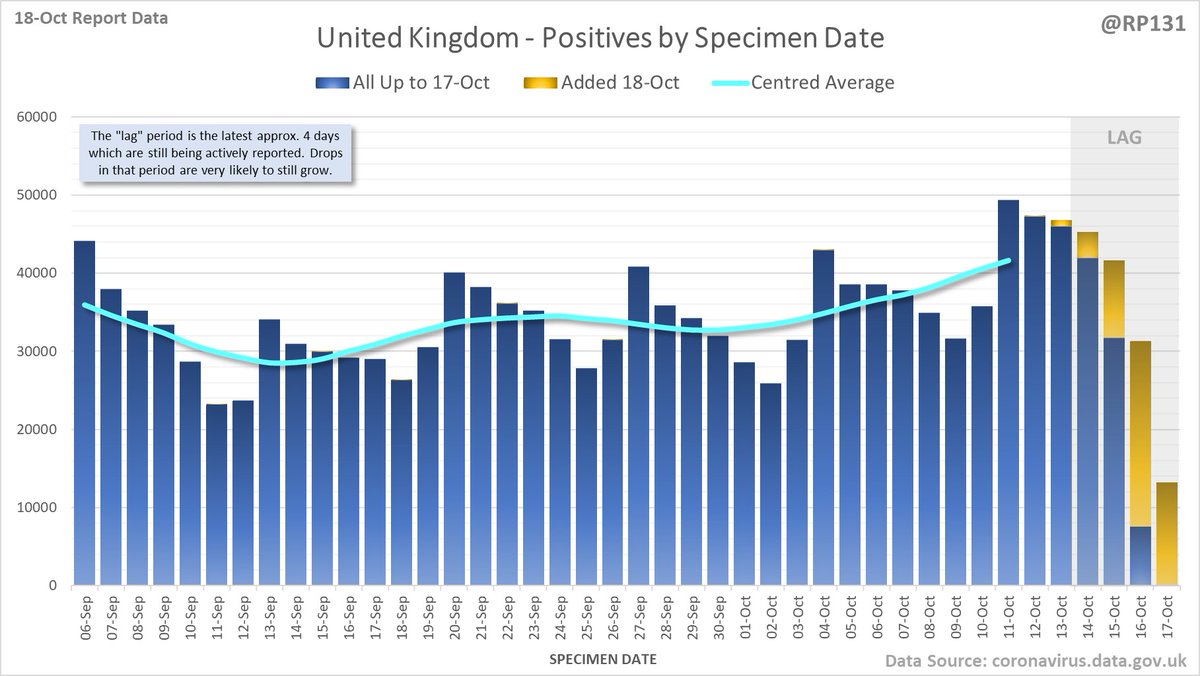 Longer term view. 49,156 new #covid19uk positive tests reported today (18-Oct). This brings the rolling average by specimen date (allowing 4 days for lag) to 40,538, an increase of 6523 (19%) in the last week.