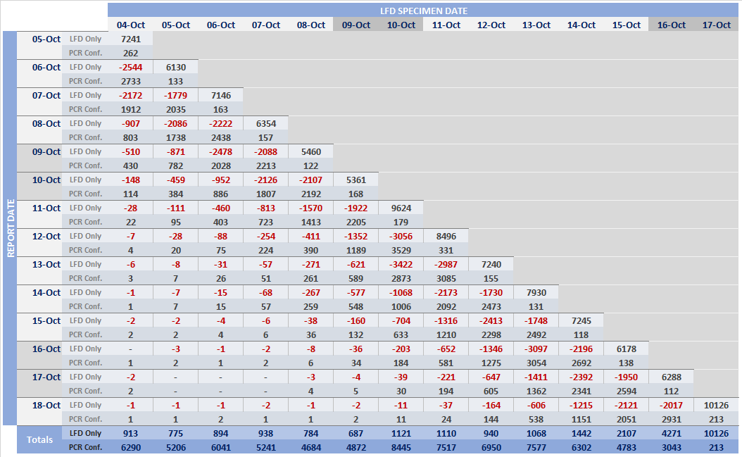 Pivot table of daily changes to LFD Only and LFD Confirmed by PCR figures to see if we can identify where LFDs are now being removed due to negative follow-up PCRs.
