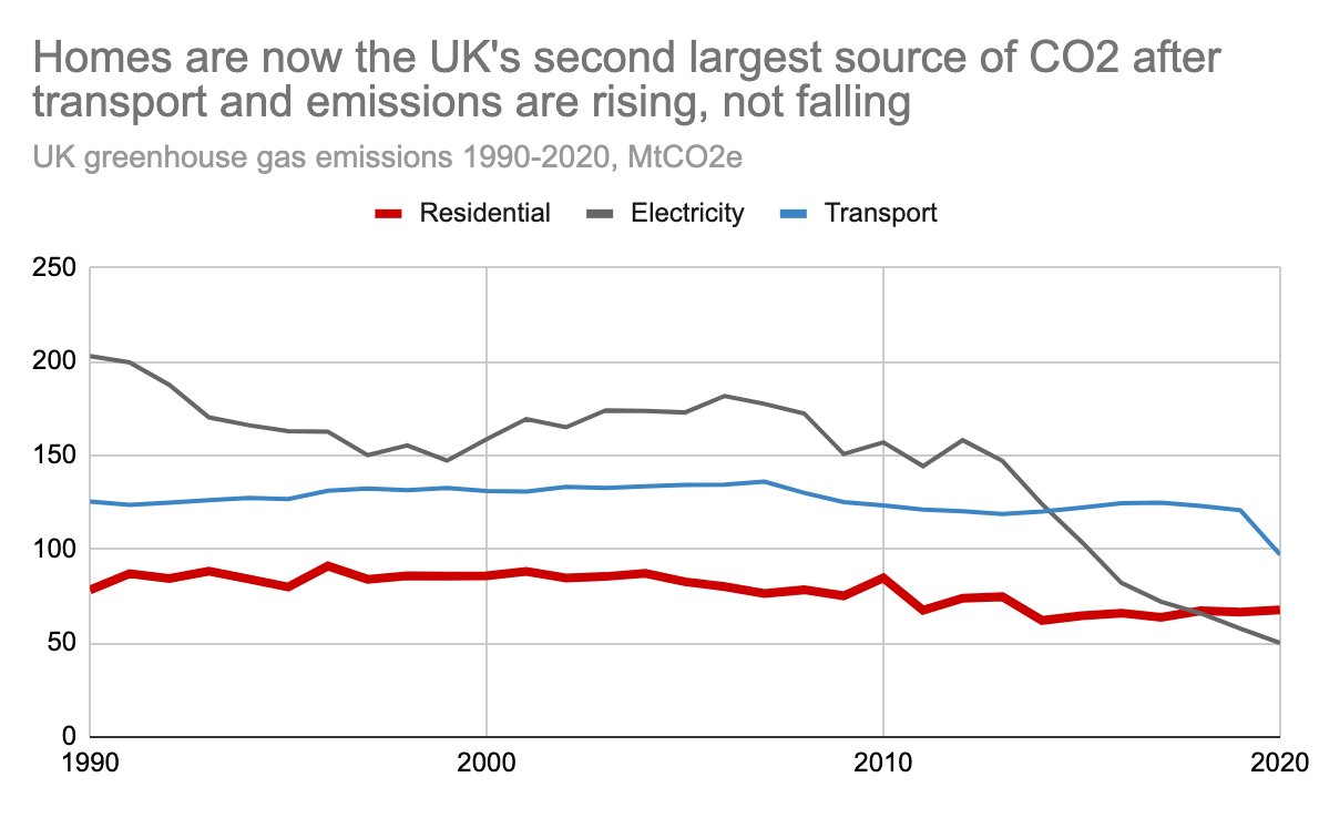 Overall, UK has made rapid recent progress thanks to nearly phasing out coal in power sector, but CO2 from homes is actually *increasing* making it the 2nd largest source of emissions after transport