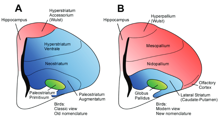 Tudo isso ocorre numa região do 🧠desses animais chamada de mesopalium (ou hiperestriado ventral), juntamente do hipocampo, super envolvido na formação de memórias, além de regiões de processamento visual e outras