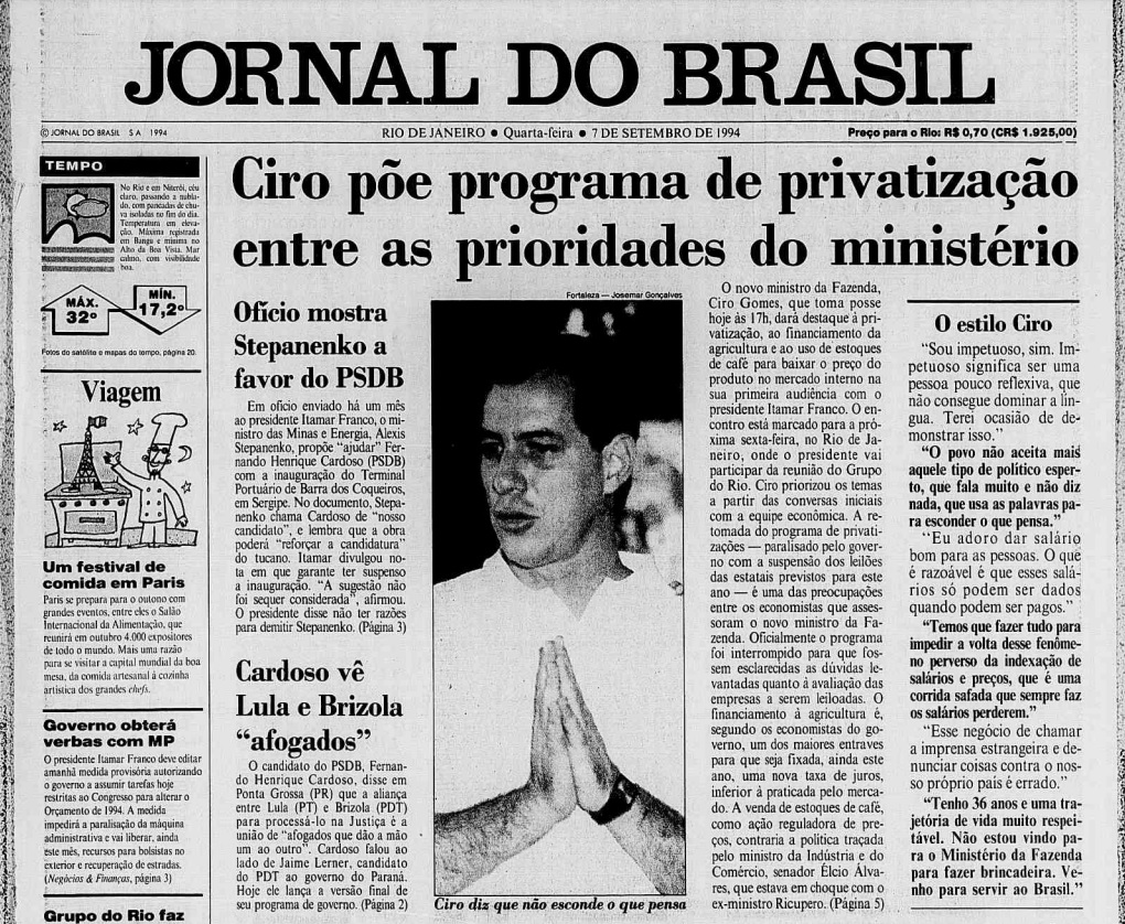 Manchete do Jornal do Brasil informando sobre a posse de Ciro Gomes como Ministro da Fazenda do governo Itamar Franco e sua intenção de acelerar as privatizações e a dar continuidade ao receituário neoliberal e ao processo de abertura da economia iniciado por Collor.