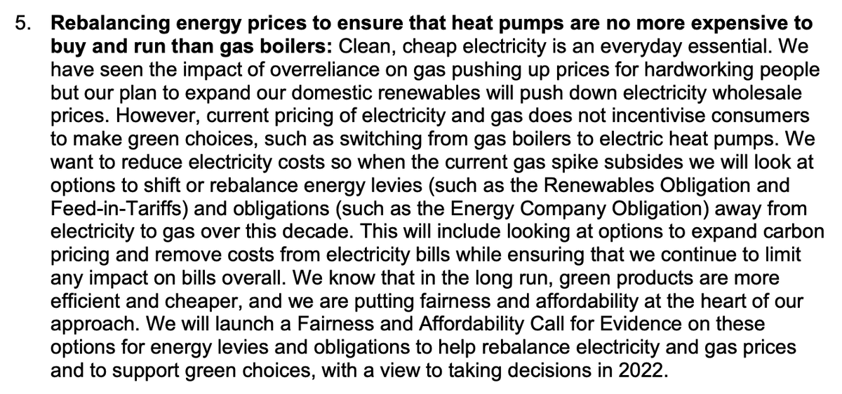 6) Rebalancing levies to make heat pumps cheaper to run: The document correctly states that 'current pricing of electricity and gas does not incentivise consumers