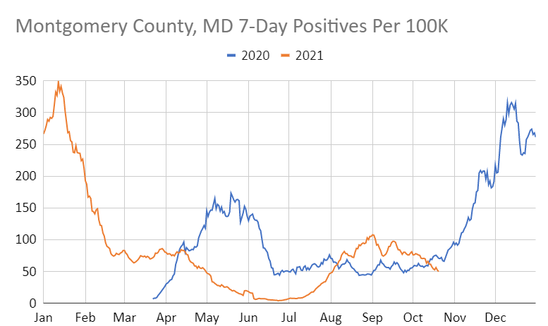 MoCo 77 positives. Trigger is reached. Mask mandate ends automatically in 7 days if the next 7 days is also under 50 positives/100k pop.