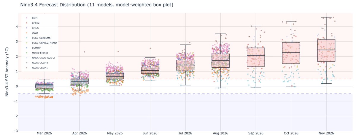This is based on a collection of 11 different models (and 455 individual ensemble members) all updated since the start of March. I've put an interactive version of the data up on the Climate Dashboard here: dashboard.theclimatebrink.com/#enso