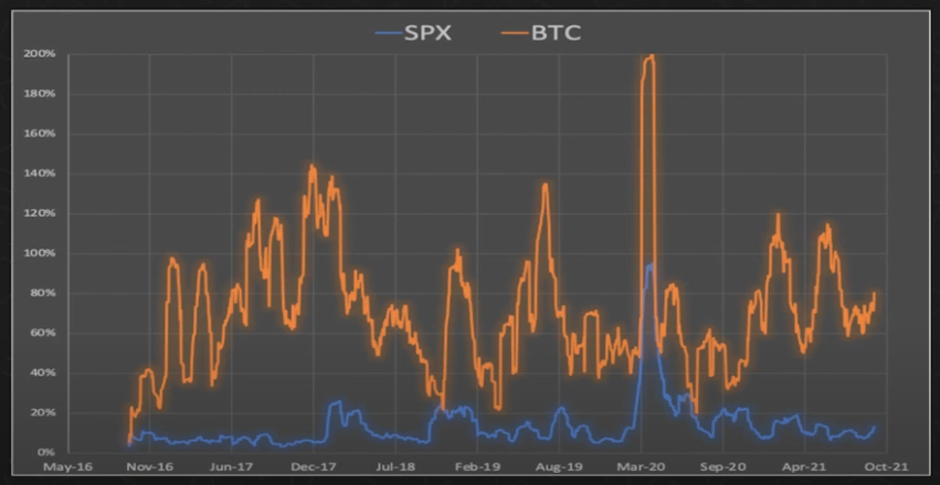 As of Oct 1, 2021 the volatility of #Bitcoin is ~80% annualized, for comparison the volatility of the SP500 is ~13% annualized.