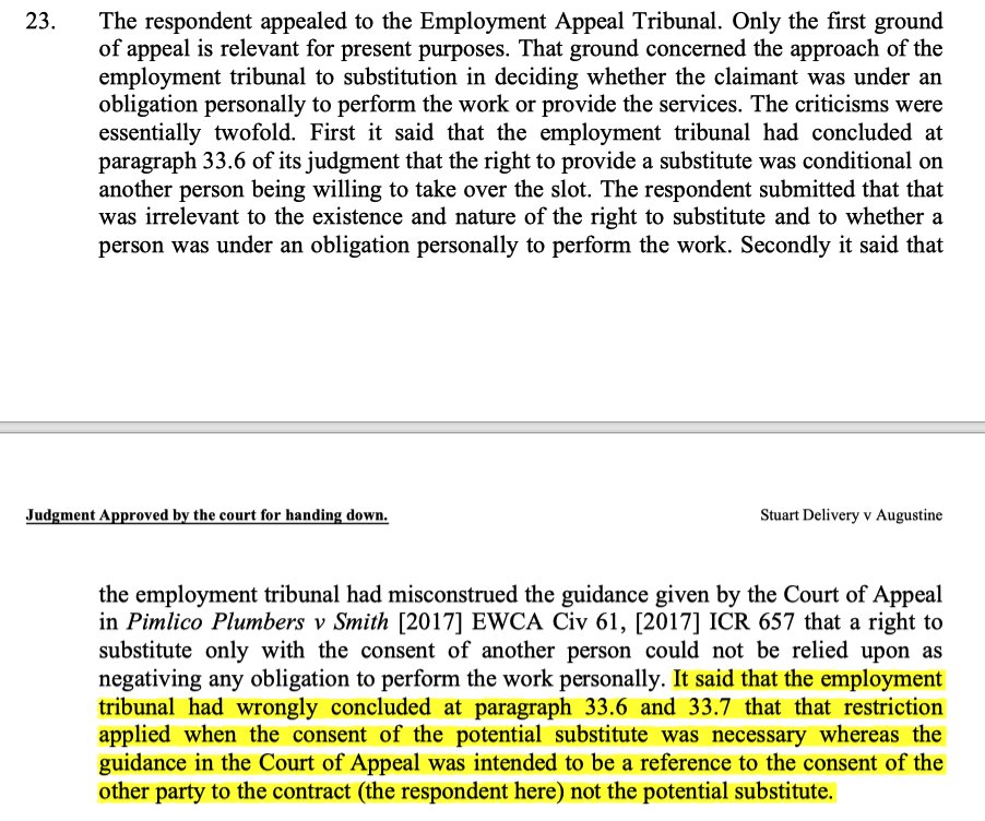 8/ The ET's reasoning identified the situation here as falling into the 5th category of substitutions in the CA decision in Pimlico Plumbers (see below), which wasn't inconsistent with personal performance. SD asserted on appeal this wasn't a 5th category case.