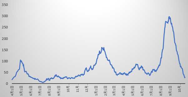 10/13の747人から7日間増加傾向持続で823人へ。