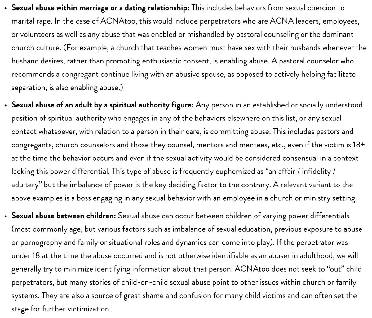 Another question we hear is, "what 'counts' as abuse?" Because sexual abuse comes in many forms & is often multi-faceted, we've assembled examples of sexually abusive behavior in our Guidelines, though these are neither mutually exclusive nor exhaustive. acnatoo.org/telling-your-s…