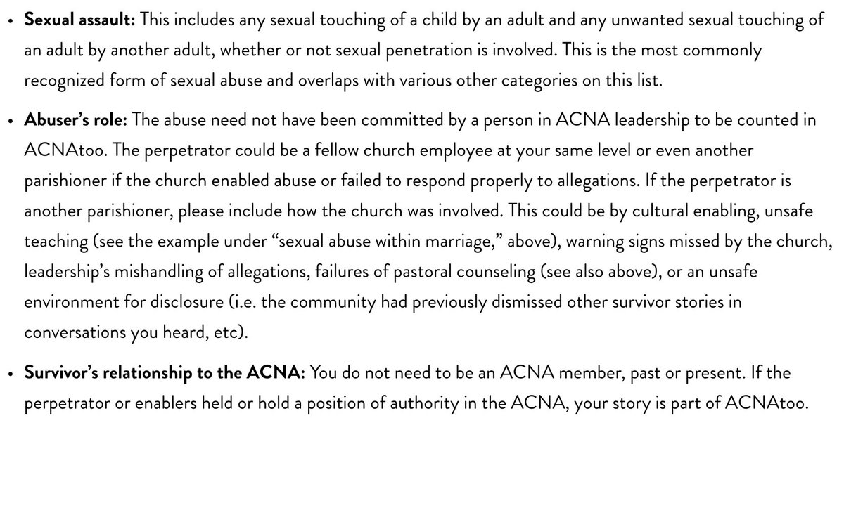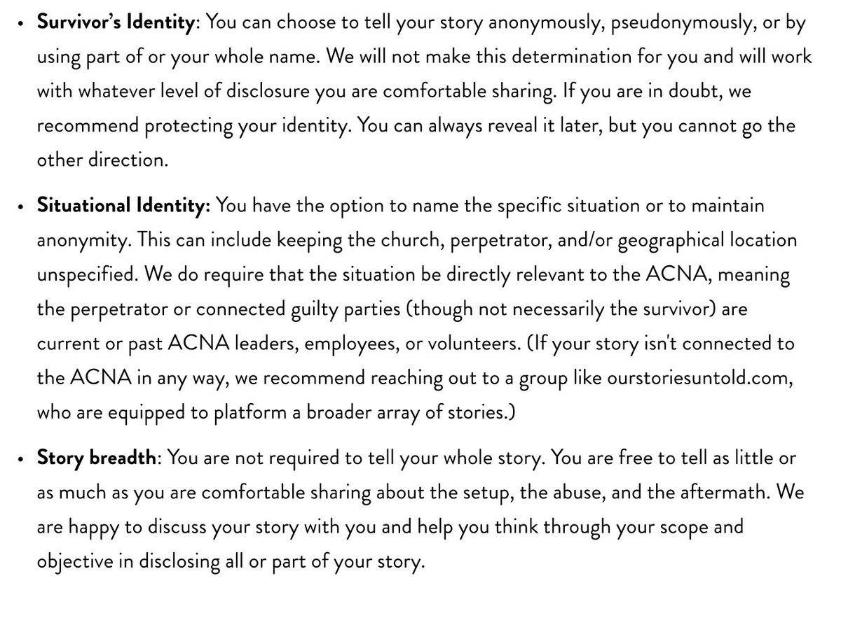 Until we finalize our Spiritual Abuse Guidelines, if you have experienced spiritual abuse within the ACNA & wish to reach out with your story, you can utilize the same guidelines re disclosure and identifying information & we will work individually with you to refine your story.