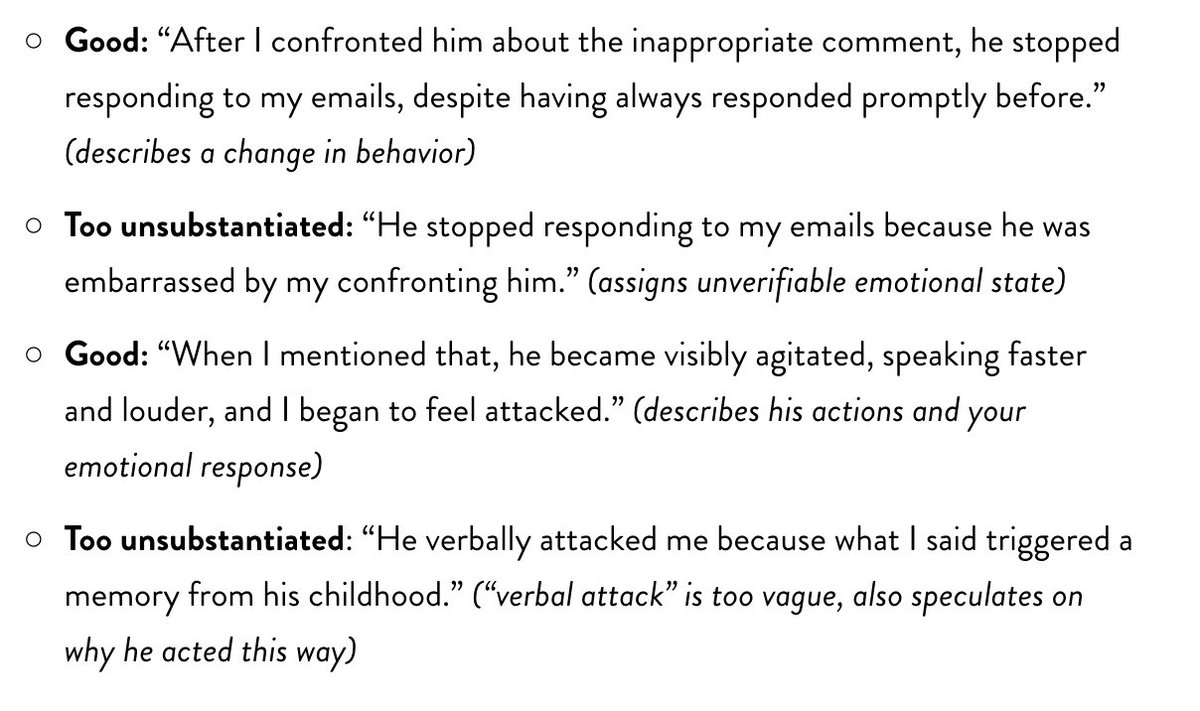 Avoid assigning conscious intent or otherwise speculating on a person’s internal state or emotions. In other words, stick to their words and actions.