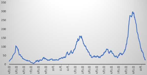 しかし、この後にピーク時には7日移動平均で1日17万人を超えたデルタ株による流行が起こっています。