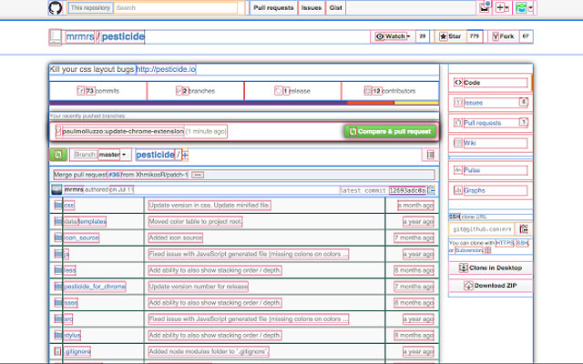 This extension inserts the Pesticide CSS into the current page, outlining each element to better see the placement on the page.