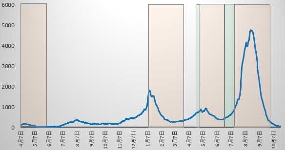 しかし、この後にピーク時には7日移動平均で1日17万人を超えたデルタ株による流行が起こっています。