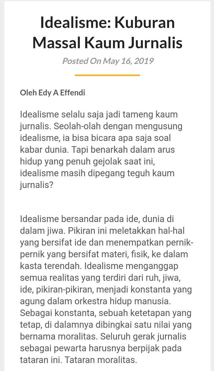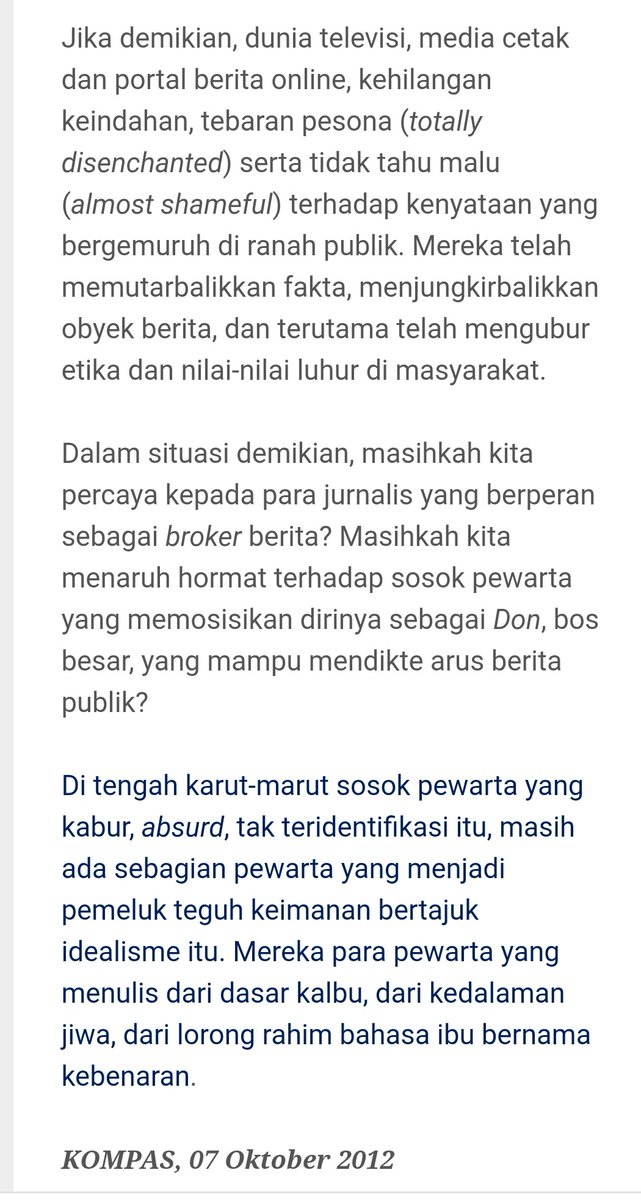 Tak semua wartawan bisa menulis opini, apalagi menulis opini atau esai di koran sekelas @hariankompas. Wartawan bisa saja menulis berita tapi belum tentu bisa menulis opini atau esai. Ini fakta. Fakta banyak wartawan yang masih kedodoran dalam menulis opini, esai atau features.