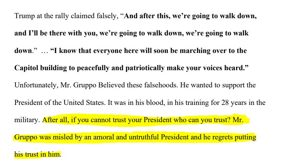 The attorney for Leonard Gruppo, a 28-year Army veteran who pleaded guilty in the #CapitolRiot, has filed his sentencing memo asking for probation in the case. He says Gruppo was "misled by an amoral and untruthful President and he regrets putting his trust in him." @wusa9