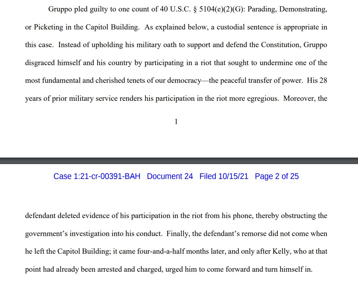 The DOJ has asked for Leonard Gruppo, who pleaded guilty in August to 1 misdemeanor count of parading, to serve 30 days in jail. It argues his military service makes his participation in the #CapitolRiot all the more egregious. Doc: storage.courtlistener.com/recap/gov.usco…