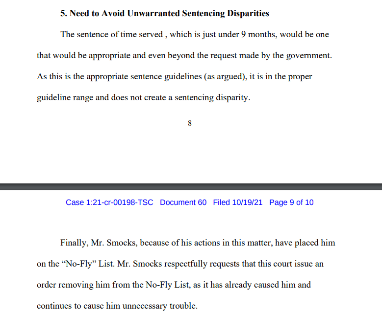 Troy Smocks' attorney, John Machado, argues the 9 months his client has already served is sufficient. He's asking for time served and for him to be removed from the "No-Fly" list. Docs: storage.courtlistener.com/recap/gov.usco…