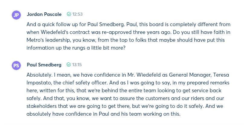 Board Chair Paul Smedberg says he has confidence and faith in Metro leadership from Paul Wiedefeld down the chain.