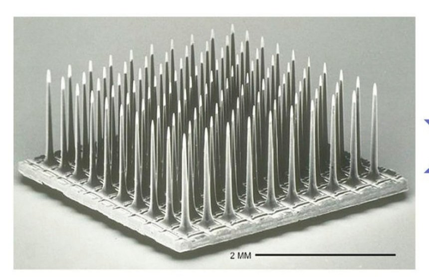 O neurocirurgião implantou uma matriz de microeletrodos com 100 microagulhas no córtex visual dela, para registrar e estimular neurônios localizados próximos aos eletrodos.