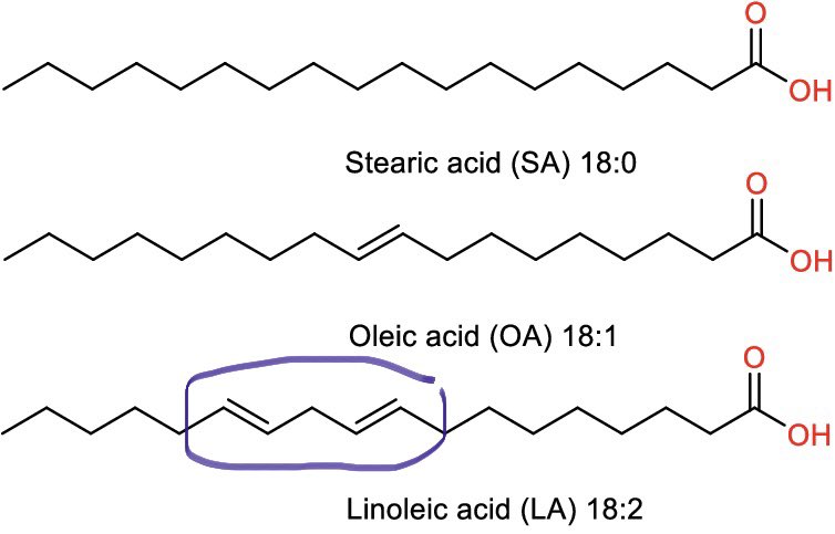Perbandingan jenis minyak pula, linoleic acid ialah asid lemak tak tepu (ada double bond) dan lebih bagus berbanding asid stearic dalam majerin susu dan lelain.