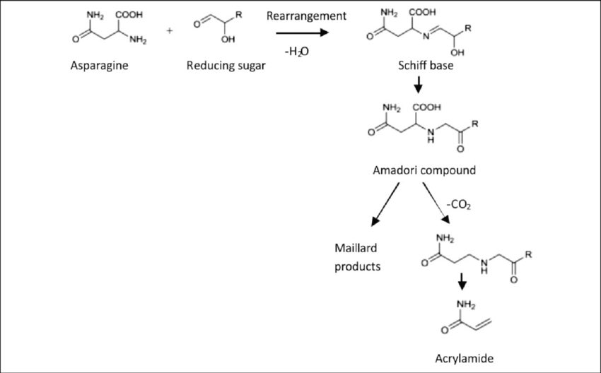 Acrylamide ialah hasil tindakbalas antara asid amino asparagine (dari protein lemak) dengan glukosa pada suhu tinggi. Nama proses ni ialah Mailard reaction.