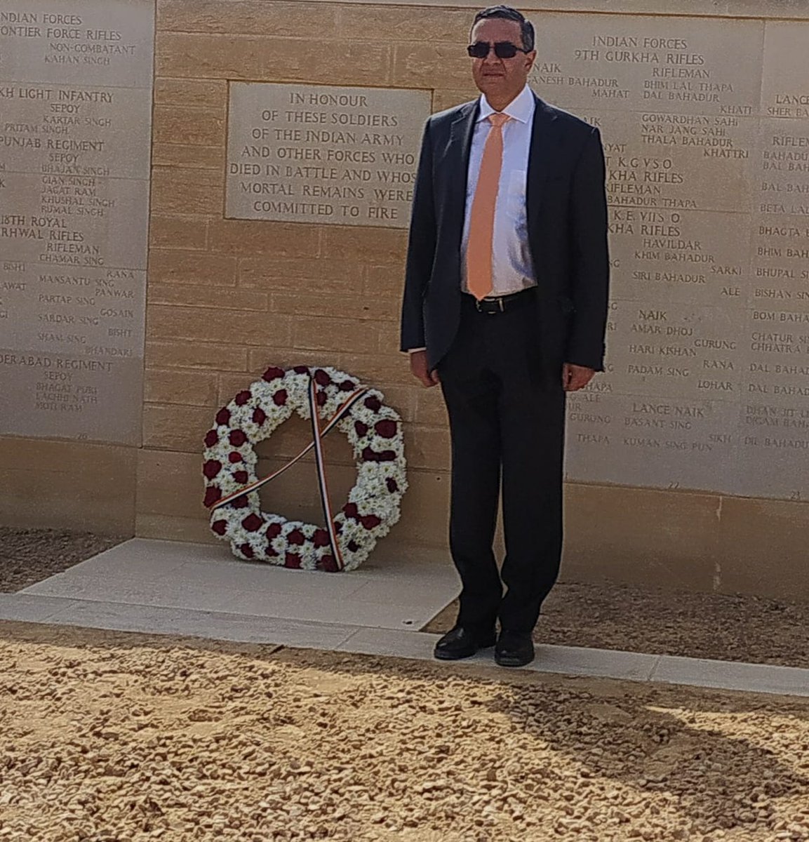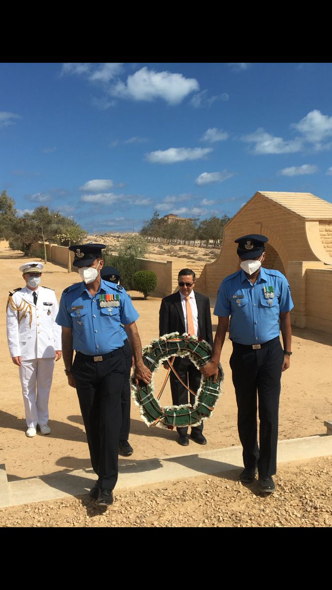 Ambassador @AjitVGupte paid homage to the martyred #IndianArmy soldiers at 79th Anniversary of 2nd Battle of El Alamein in Commonwealth War Graves cemetery on 23 Oct 2021. (1/2)