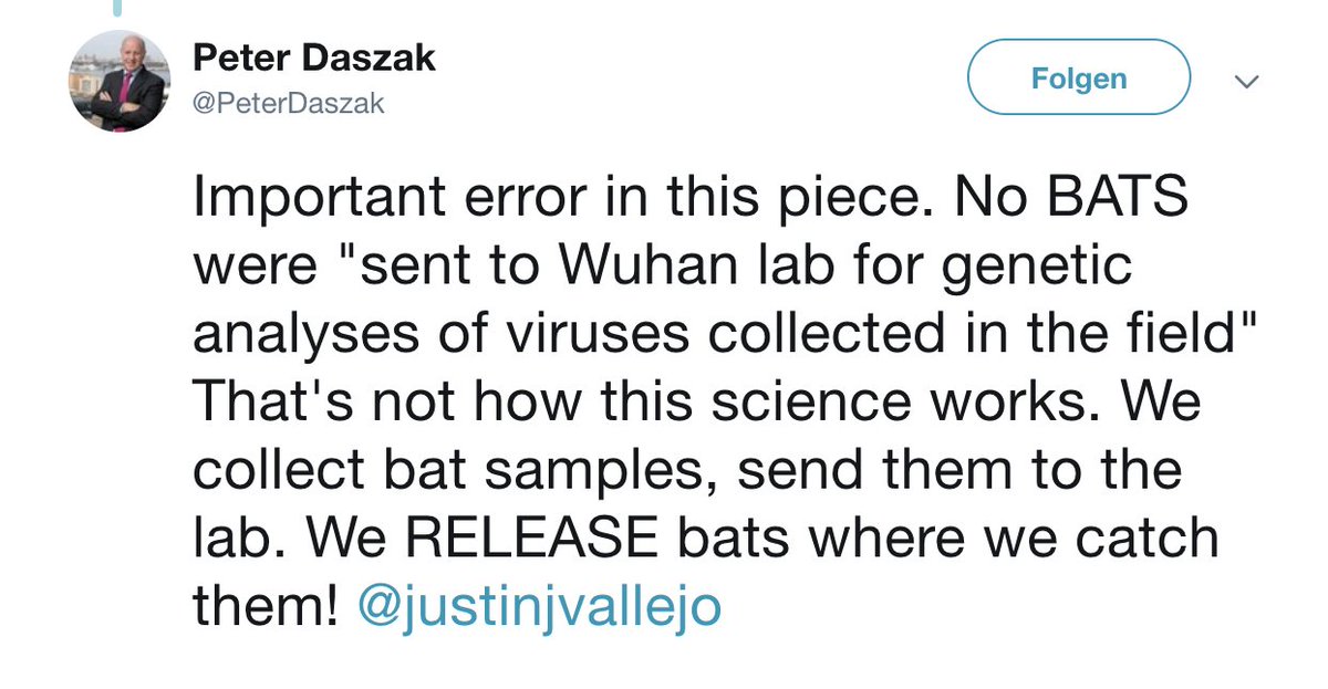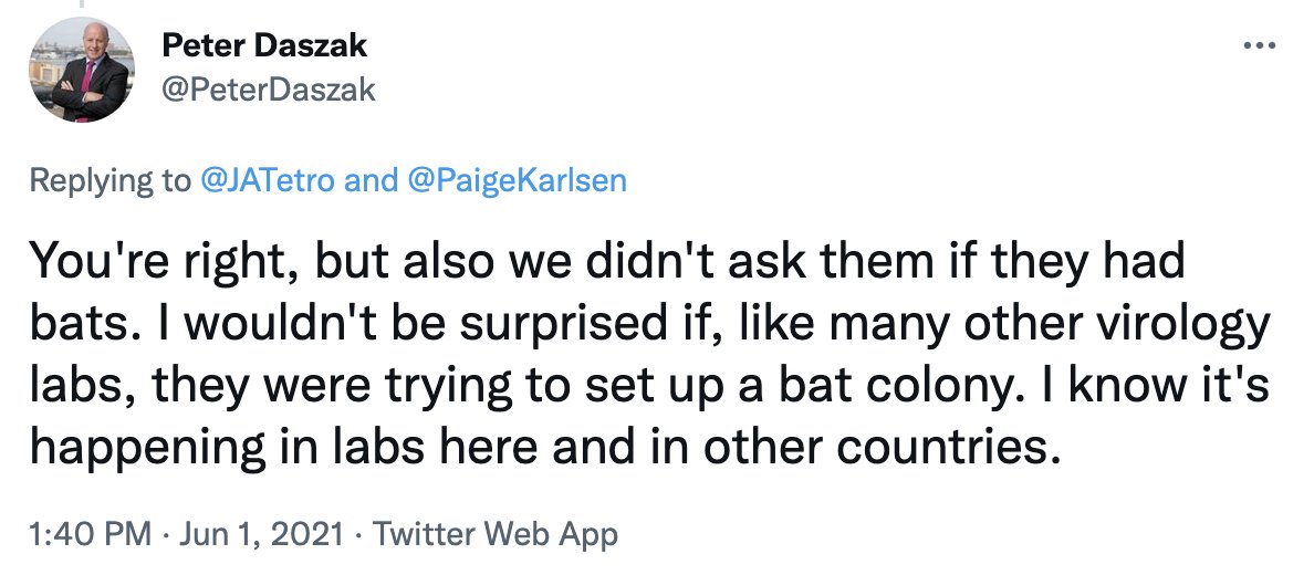 June 2021, Daszak tweets "I wouldn't be surprised if, like many other virology labs, they were trying to set up a bat colony." taiwannews.com.tw/en/news/4227123