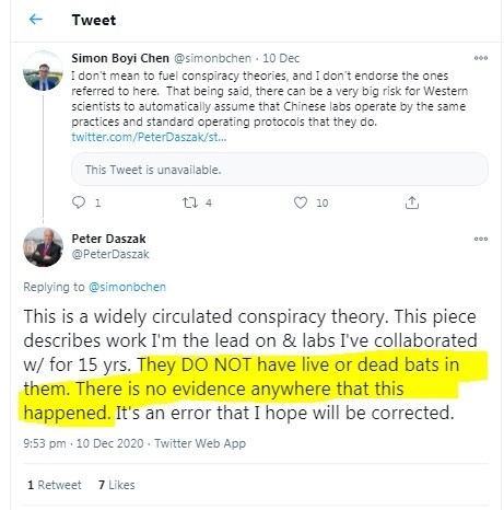 Dec 2020, Daszak says no bats were sent to Wuhan lab and it's a conspiracy theory.