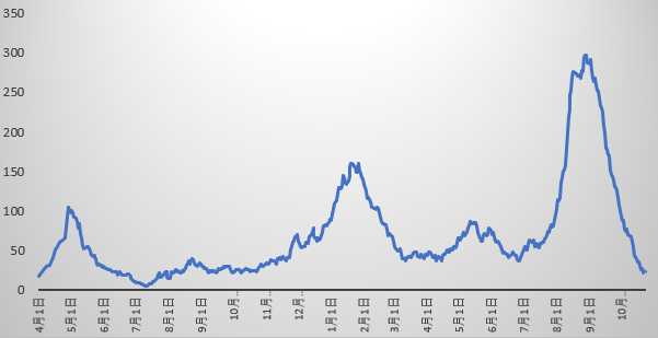 今年はすでに夏の段階から、過去シーズンよりも高めに推移しています(ピンク)。