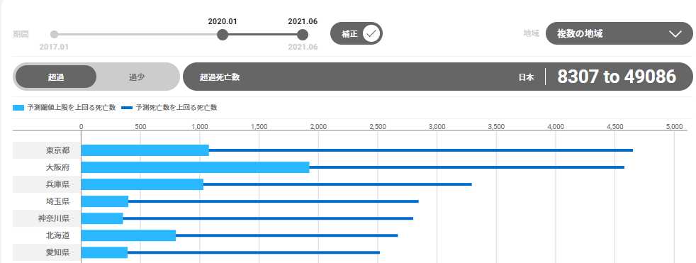 1-6月に予想死亡数の95%信頼区間上限を上回った超過死亡数は日本全国で8307人。