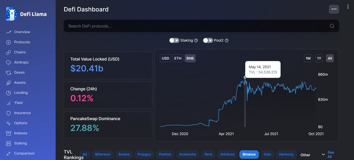 Podemos decir que este es el ranking según el que menos ha bajado en TVL desde su máximo histórico.