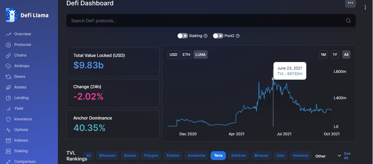 5/8 Cuando analizamos el TVL de los protocolos #DeFi en la red #Terra medido en el token de la red que es el #LUNA observamos que fue el 23 de junio cuando alcanzó el máximo de 667.830.000 y desde entonces está bajando a 226.390.000 LUNA por lo que ha caído desde su máximo un 66%